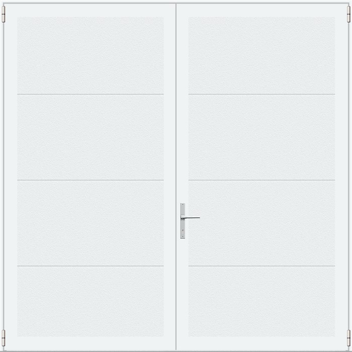 Deze openslaande deuren zijn opgebouwd uit 40 mm dikke geïsoleerde panelen zonder extra horizontale belijningen en zijn voorzien van een stuccostructuur. Standaardkleur is RAL 9016.