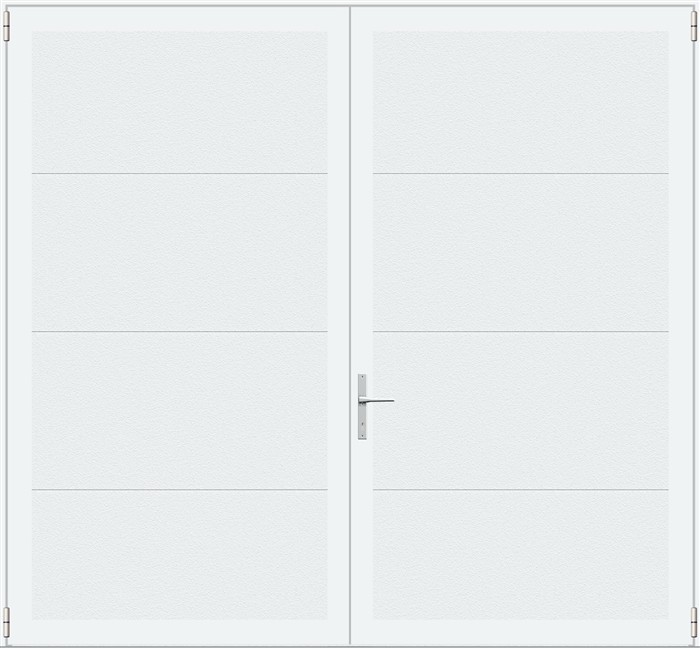 Deze openslaande deuren zijn opgebouwd uit 40 mm dikke geïsoleerde panelen met meerdere diepe horizontale belijningen en het oppervlak is glad uitgevoerd. Standaardkleur is RAL 9016.