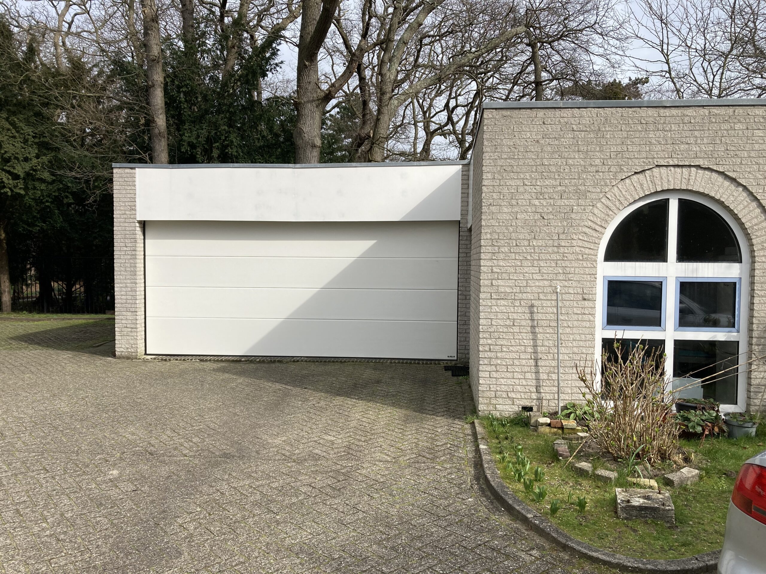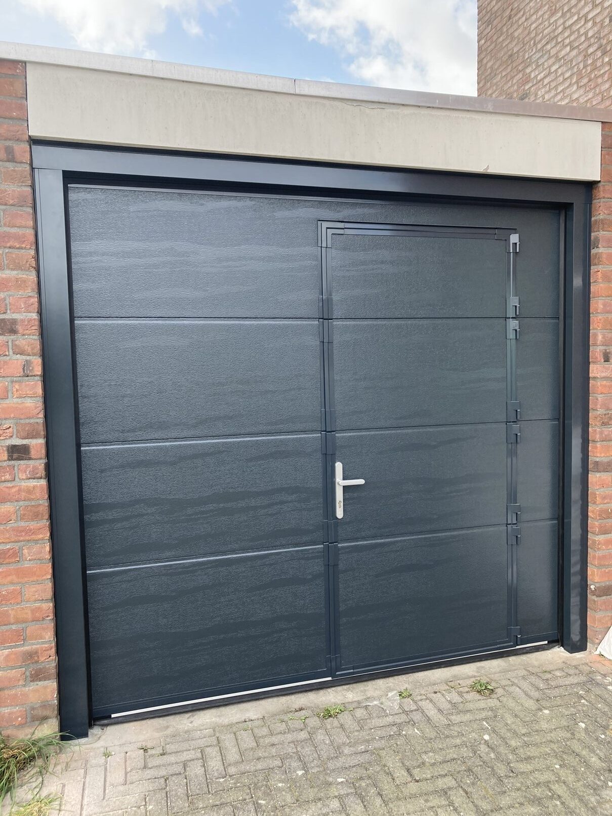 De klant wilde van de garage een werkruimte maken die in de winter goed afsluitbaar is. Een sectionale garagedeur met loopdeur bleek hiervoor de juiste oplossing. Om extra ruimte te creëren is een 3-zijdig montageprofiel toegepast, waardoor de garagedeur circa 20 cm naar voren is geplaatst. De garagedeur zelf wordt nauwelijks gebruikt, maar de loopdeur heeft zich in de praktijk als een waardevolle investering bewezen.