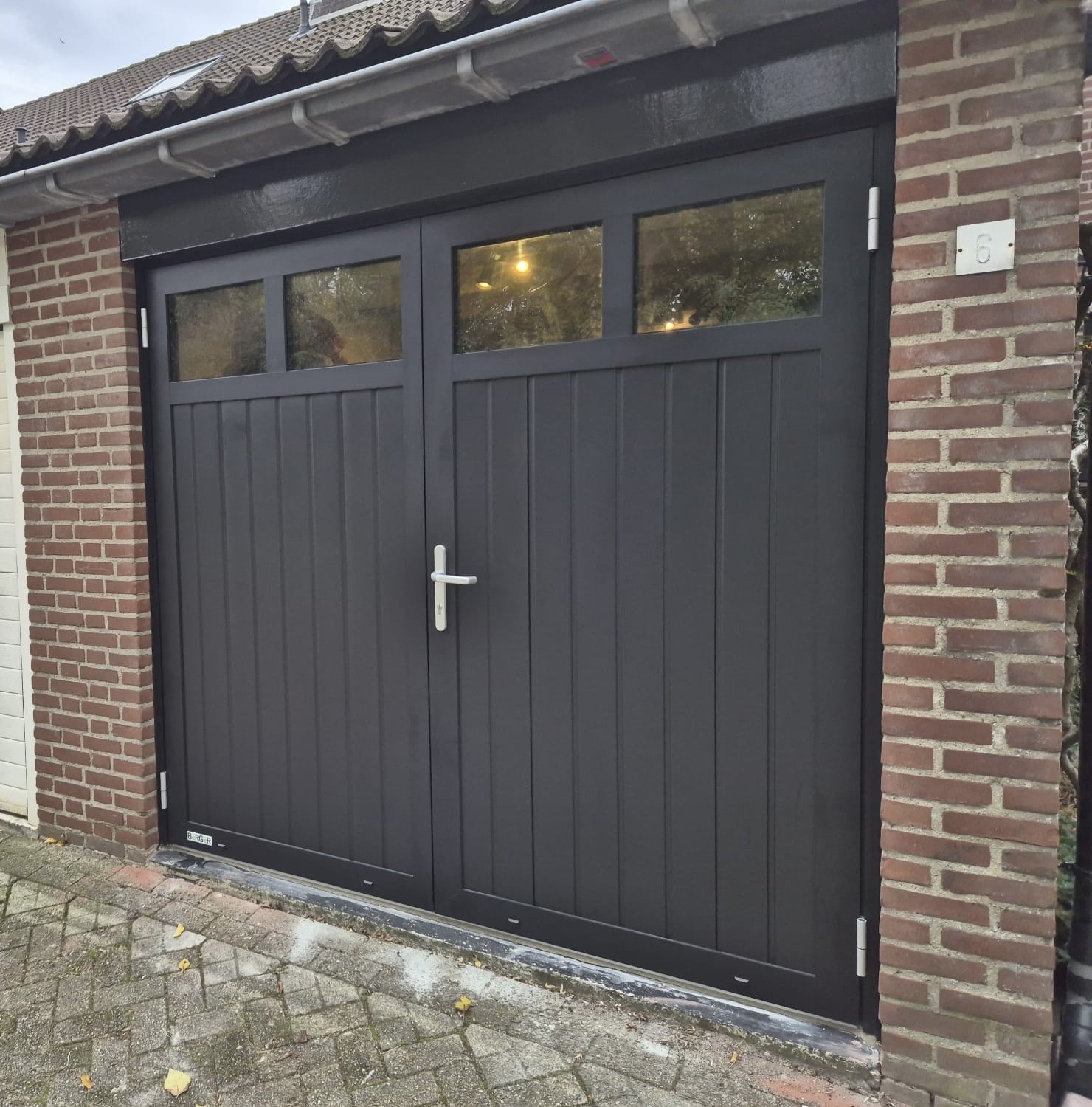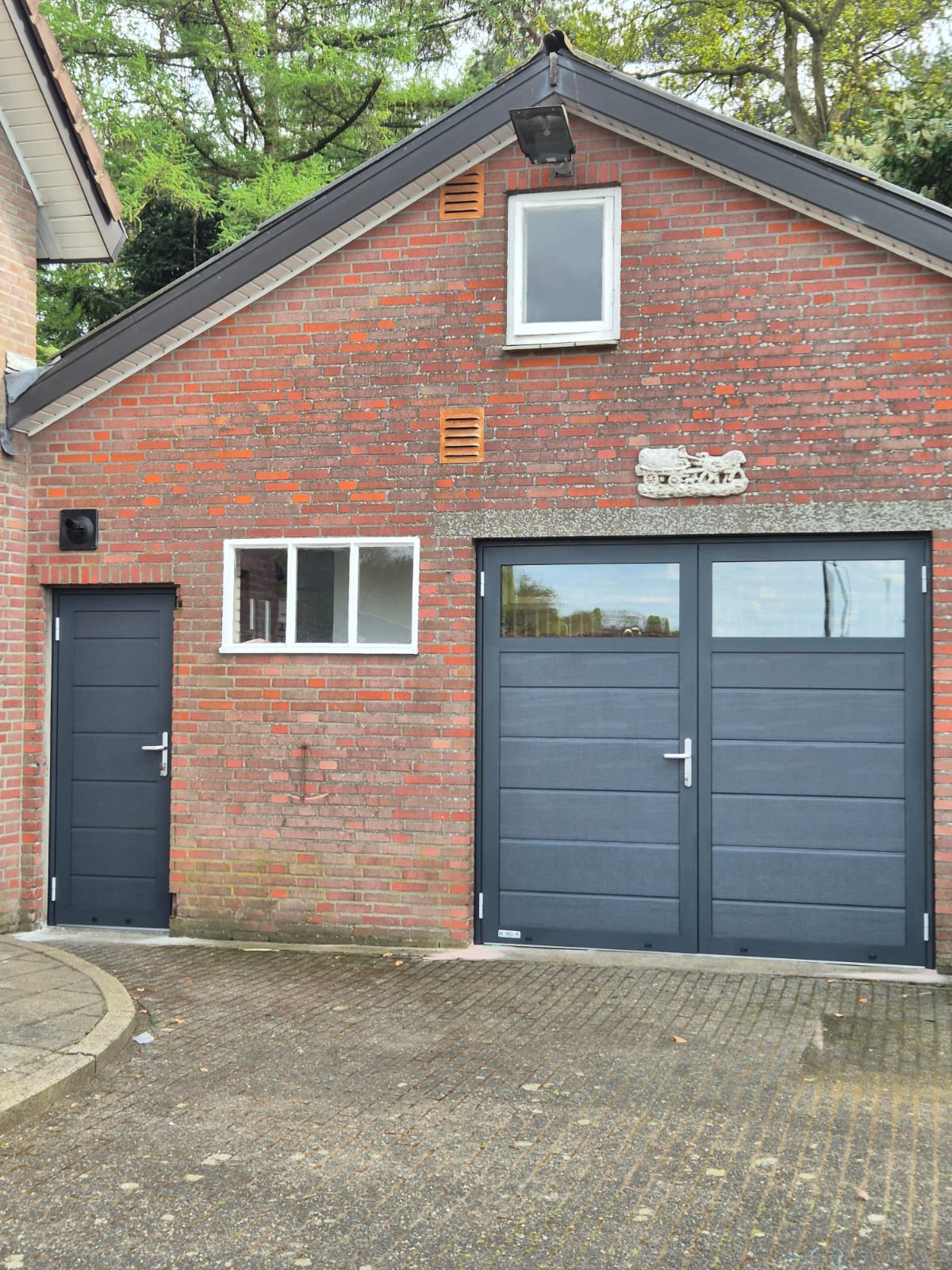 Deze klant oriënteerde zich eerst op een sectionale garagedeur met loopdeur. Tijdens het adviestraject bleek dat openslaande deuren beter pasten bij de woning en de uitstraling van de gevel. De deuren zijn uitgelijnd met de voordeur voor een rustig en samenhangend geheel. Uitgevoerd met Satin Plano panelen en een glassectie met gesatineerd dubbel hardglas in RAL 7040 mat fijnstructuur. Naar aanleiding van dit project hebben wij in dezelfde straat nog twee families mogen helpen.