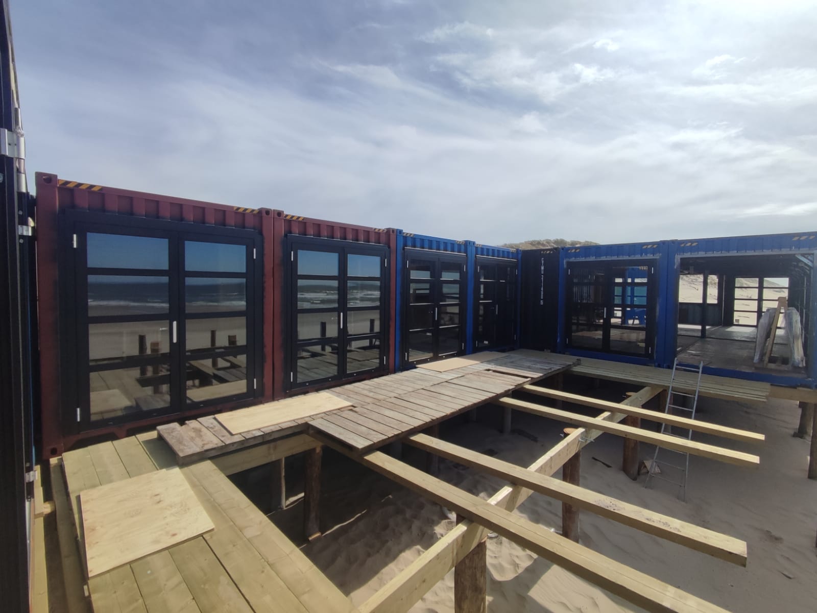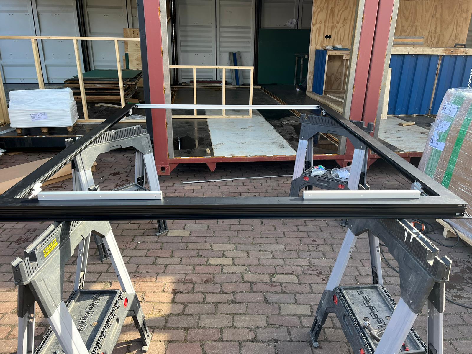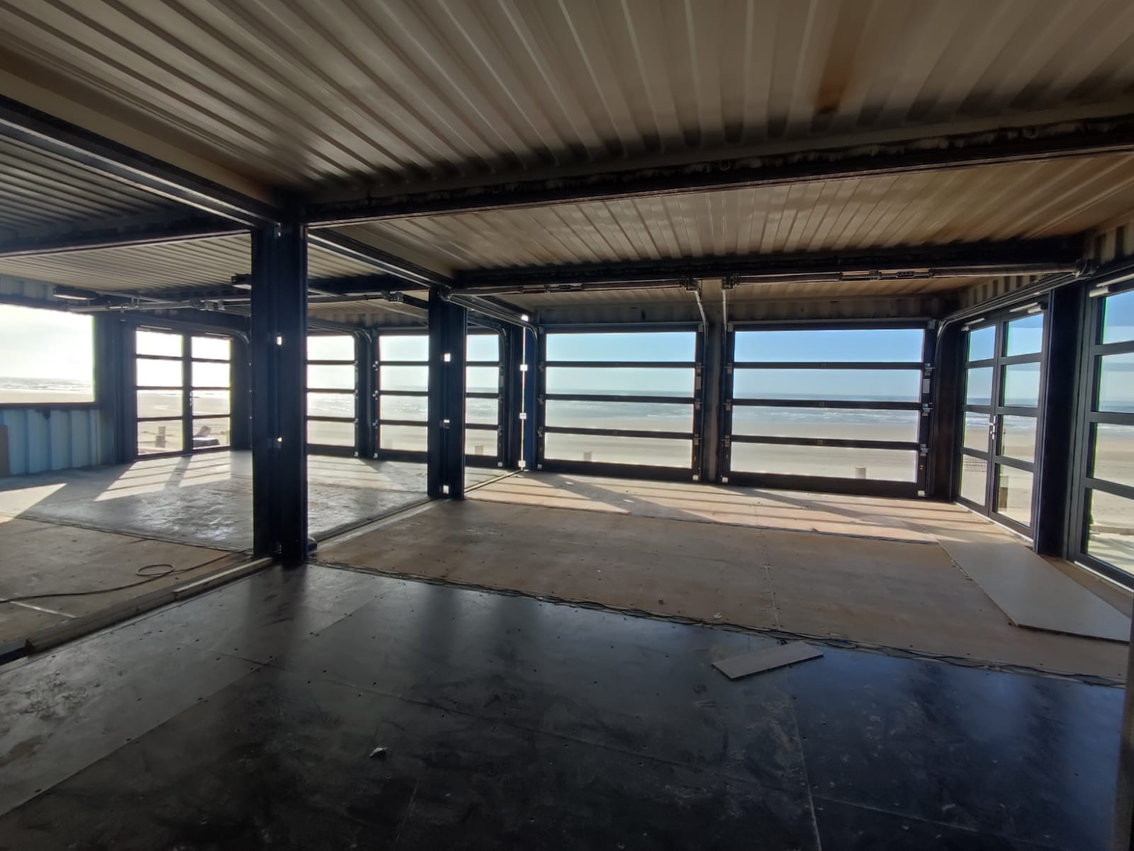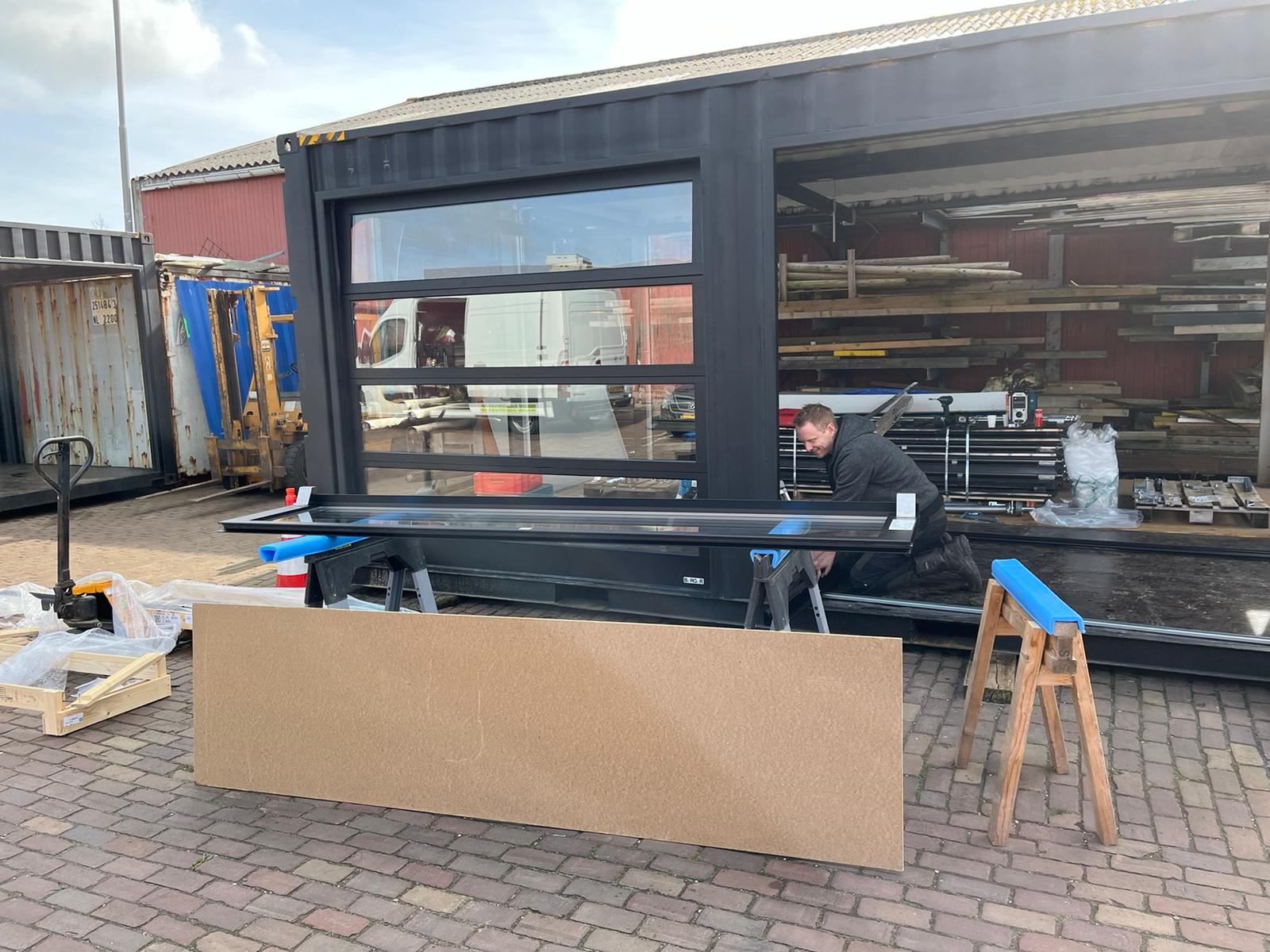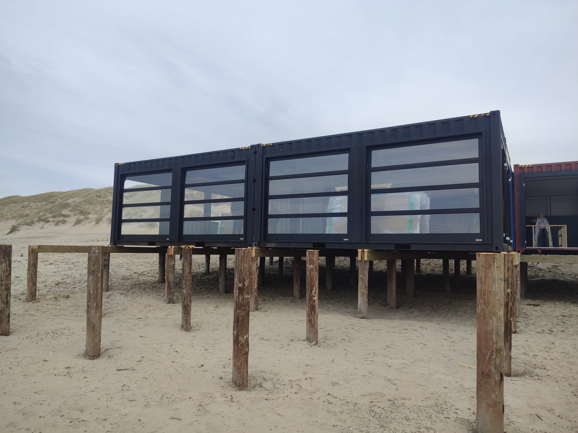 De containerunits stonden vooraf opgesteld in de werkplaats. In deze fase hebben wij de voorbereidende werkzaamheden uitgevoerd die essentieel zijn voor een efficiënte montage op locatie. In de werkplaats zijn de kozijnen en rails gemonteerd en voorbereid, zodat de basis volledig gereed was voordat alles naar het strand werd vervoerd. Door deze werkwijze kon een groot deel van het werk onder gecontroleerde omstandigheden plaatsvinden.