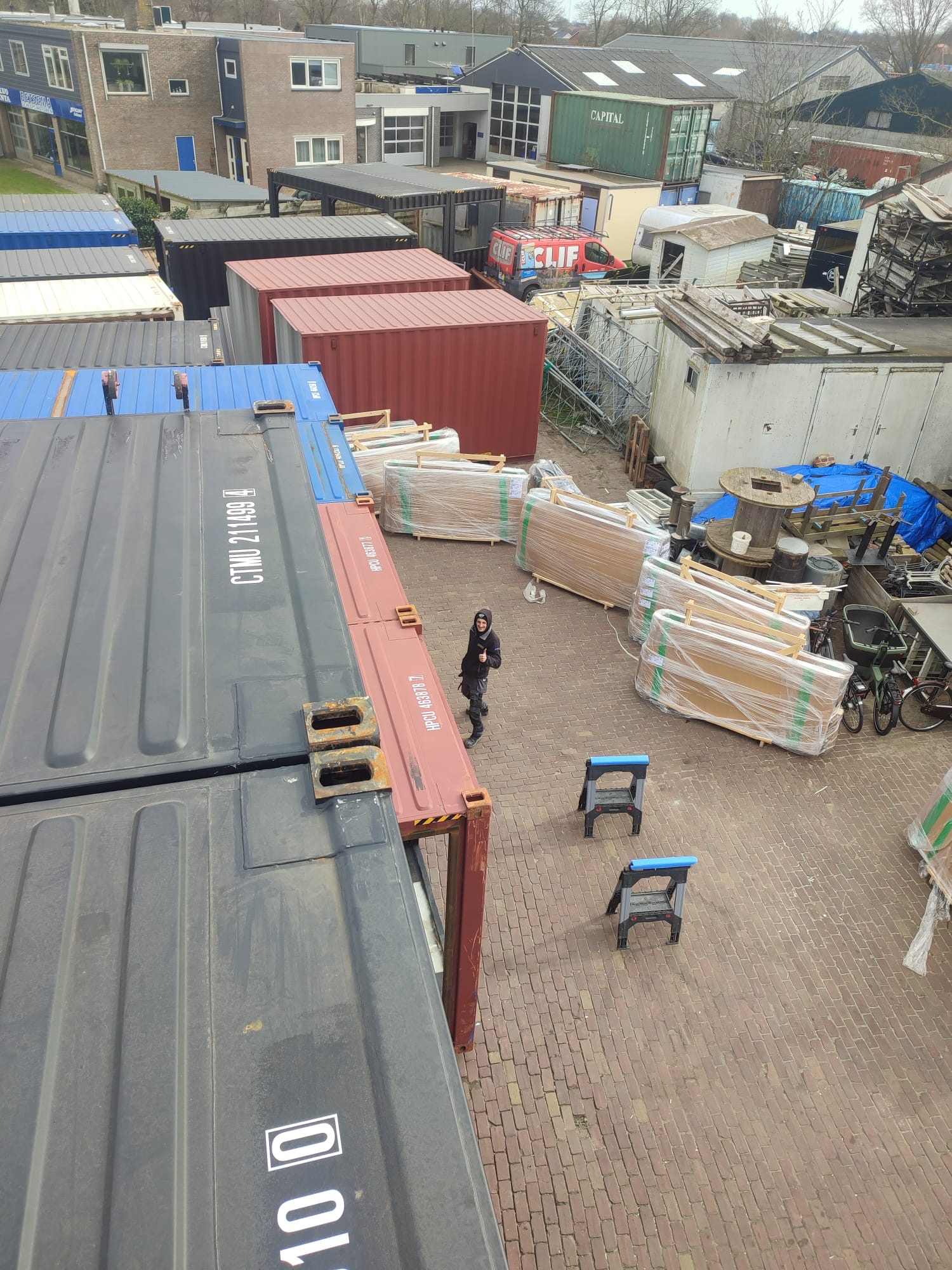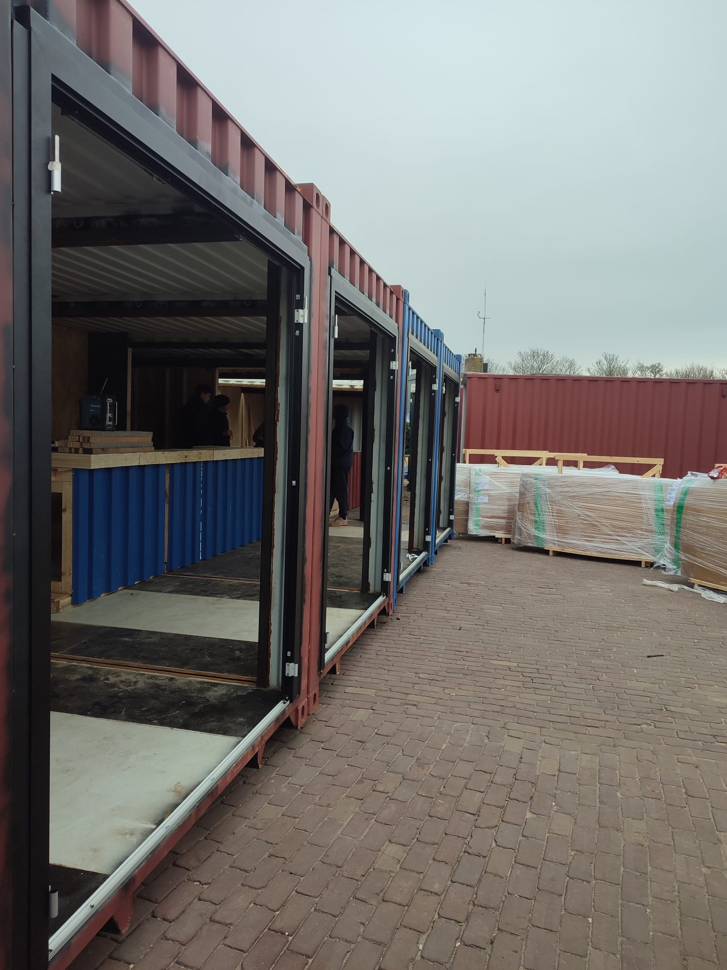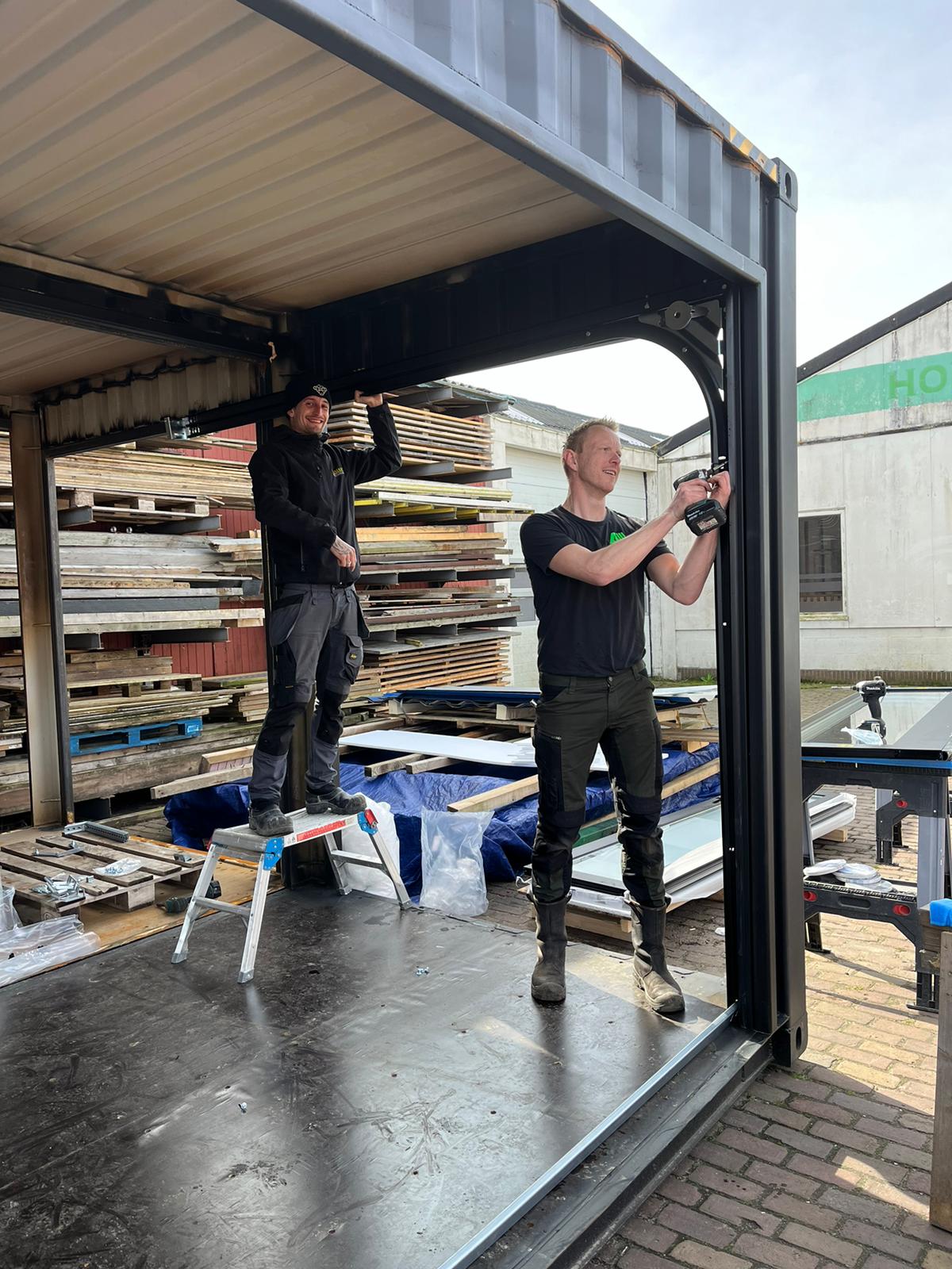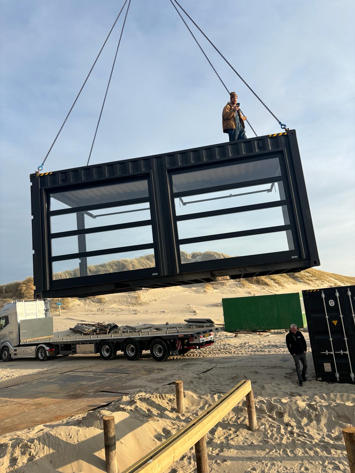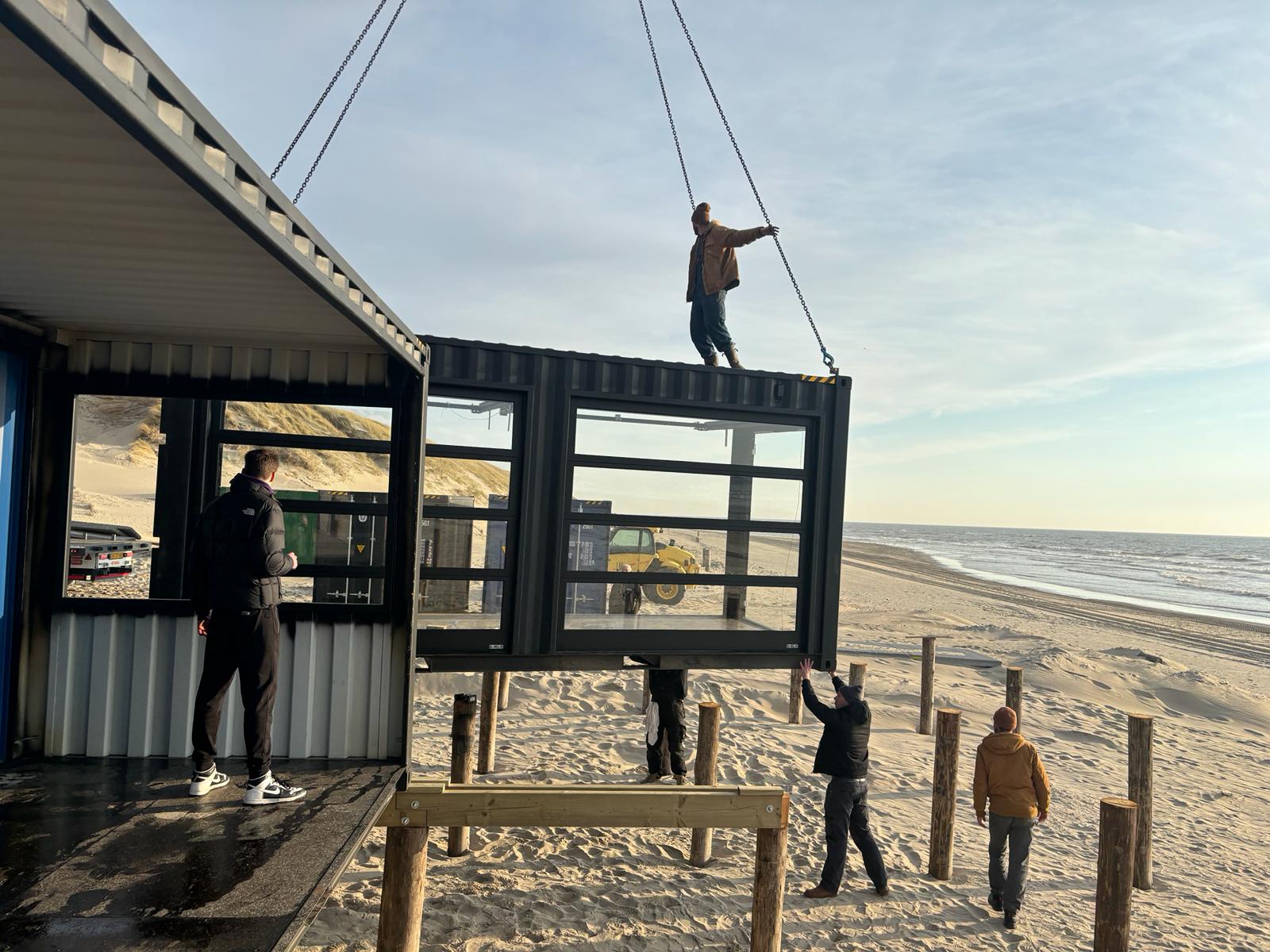 De containerunits stonden vooraf opgesteld in de werkplaats. In deze fase hebben wij de voorbereidende werkzaamheden uitgevoerd die essentieel zijn voor een efficiënte montage op locatie. In de werkplaats zijn de kozijnen en rails gemonteerd en voorbereid, zodat de basis volledig gereed was voordat alles naar het strand werd vervoerd. Door deze werkwijze kon een groot deel van het werk onder gecontroleerde omstandigheden plaatsvinden.