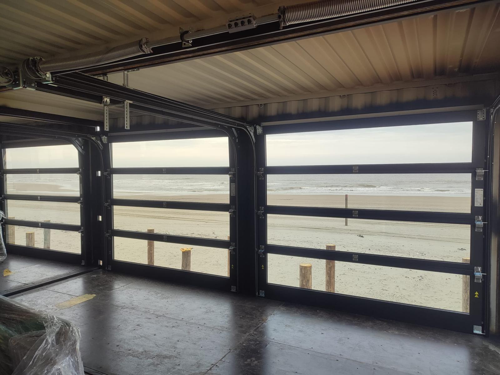 Na transport naar het strand zijn de garagedeuren en openstaande deuren afgemonteerd. Op locatie zijn de Berger Top Line garagedeuren afgehangen en nauwkeurig afgesteld. Daarnaast zijn de panelen geplaatst en zijn de motoren ingezet en ingeregeld. Deze aanpak zorgt ervoor dat de montage op het strand beheersbaar blijft en dat alle deuren direct correct functioneren.