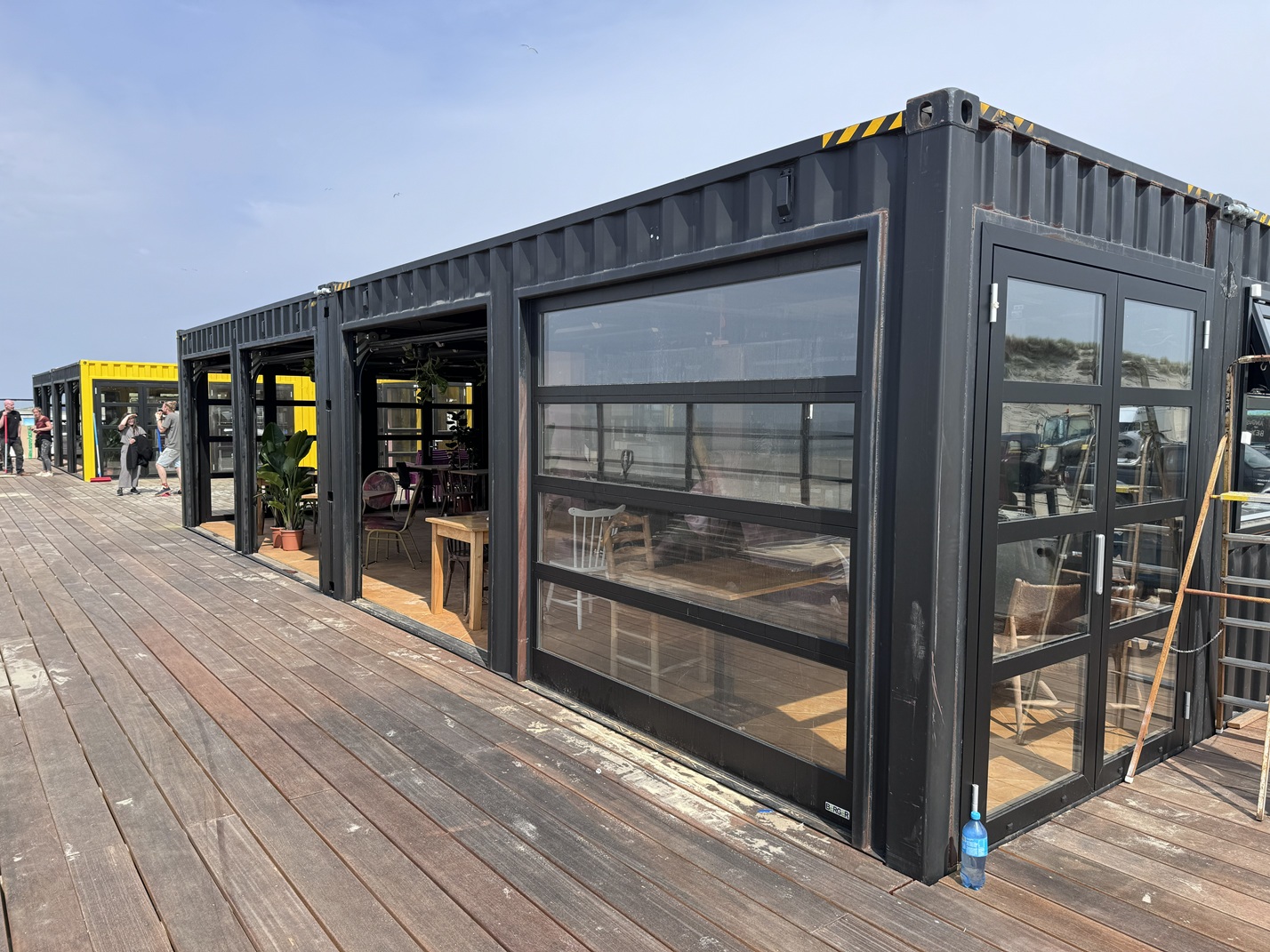 Het eindresultaat is een krachtig en doordacht geheel. Een paviljoen waarin de garagedeuren zijn voorbereid en gemonteerd met het oog op jaarlijks demonteren en opnieuw opbouwen, en dat ontworpen is voor intensief gebruik in een veeleisende kustomgeving.
