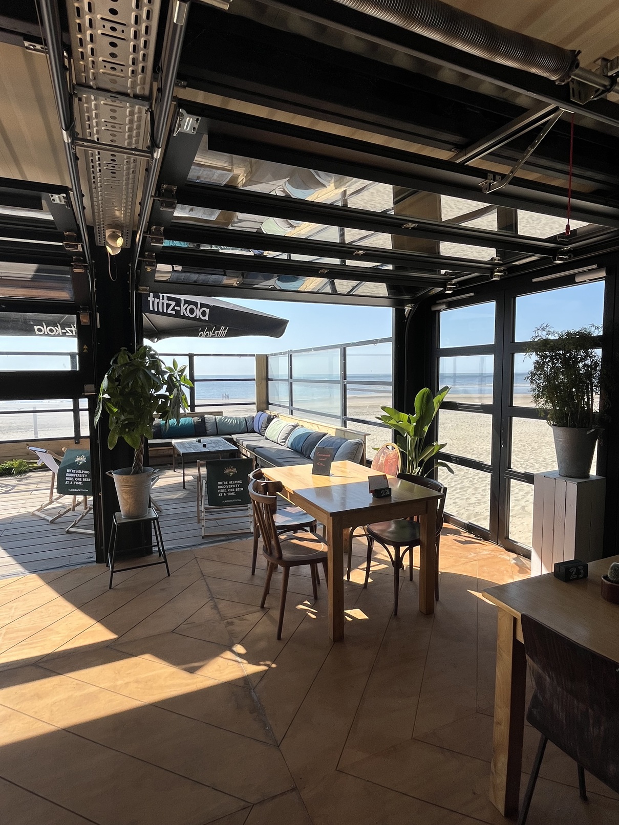 De Berger Top Line garagedeuren zijn volledig gevuld met glas. Hierdoor blijft het zicht richting zee volledig behouden en krijgt het paviljoen een open en lichte uitstraling. In geopende stand maken de garagedeuren het mogelijk om het paviljoen volledig te openen richting strand en terras. In gesloten stand bieden ze beschutting tegen wind en weersinvloeden, zonder het uitzicht te verliezen. De openstaande deuren zorgen voor logische toegangen en een prettige routing binnen het paviljoen.